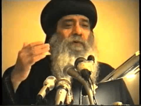 ها أقول لكم حكاية خارج المقرر يعنى زمان أنتوا عارفين إن فيه أحد البابوات عندنا أسمه البابا مكاريوس الثالث قبل البابا يوساب الثانى وقبل كدا كان مطران لأسيوط. أثناء ما كان فى اسيوط مرة واحد من السحرة كان راح زار مدير المديرية زمان كانت المحافظة أسمها مديرية والمحافظ أسمه المدير. وقاعد بقى يقول له الساحر دا أنا أقدر أعمل لك حاجة عايز الكتاب اللى عندك فى البيت أجيبه لك يمد إيده يطلع الكتاب فى إيده عايز الساعة اللى تحت المخدة أجيبها لك يمد إيده يطلّلع له الساعة شغل شياطين والمطران كان موجود بيهنى المحافظ المدير يعنى وسامع الكلام دا وساكت. وبعد شويه من الكلام اللى قاله الراجل دا المحافظ بيقول للمطران الأنبا مكاريوس بيقول له إيه رأيك يا سيدنا فى الموضوع دا ؟ فسكت. فالساحر تجرأ وقال له إيه رأيك اللى إنت تعوز تجيبه ـ بيقول للمطران ـ أجيبه لك. فأنبا مكاريوس قال له ما فيش داعى للكلام وخلينا ساكتين. فالساحر دا قال له لا أبداً كل اللى إنت تطلبه أجيبه لك. فأنبا مكاريوس قال له خلينا ساكتين وأحسن لك نكون ساكتين. أصر قال له أديك شايف بأجيب كل حاجه اللى إنت عايزه. قال له إذا كنت مصّر روح هات لى التونية بتاعتى اللى تحت الصليب فوق المذبح. التونية بتاعتى على المذبح وفوقيها صليب حاطط فوقيها صليب. يحاول الراجل يمد إيده يمد رجله يمد عقله ما فيش فايدة مش قادر يجيب التونية كلها صلبان وحاطط فوقيها صليب يقرب عليها منين دى. قال له طب أطلب حاجة تانية. قال له أنا مش عايز غير دى هى دى بس اللى تقدر تجيبها لى. ولما خجل الرجل وما قدرش يجيب حاجة وخجل أيضاً قصاد المحافظ المطران قال له كفايه عليك دى وخد بعضه وماشى والرجل ظل سابحاً فى … لأن الصليب له قوة معينة. اللى فيكم كان عايش فى أسيوط من قيمة حوالى 50 سنة ولا حاجة زى دى أو 40  يمكن يفتكر الحكاية دى (رشم علامة الصليب، الإتجاه للشرق فى الصلاة 19/03/1980).